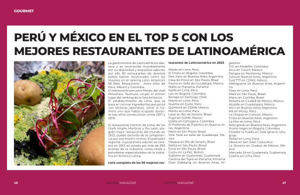 Maido en Lima , Perú El Chato en Bogotá , Colombia Don Julio en Buenos Aires , Argentina Casa do Porco en São Paulo , Brasil Fauna en Valle de Guadalupe , México Maito en Panamá , Panamá Kjolle en Lima , Perú Leo en Bogotá , Colombia Boragó en Santiago , Chile Mayta en Lima , Perú Nuema en Quito , Perú Quintonil en CDMX , México Mérito en Lima , Perú Lasai en Río de Janeiro , Brasil Pujol en CDMX , México Celele en Cartagena , Colombia El Preferido de Palermo en Buenos Aires , Argentina Metzi en São Paulo , Brasil Villa Torél en Valle de Guadalupe , México Oteque en Río de Janeiro , Brasil Nelita en São Paulo , Brasil Evvai en São Paulo , Brasil Gustu en La Paz , Bolivia Sublime en Guatemala , Guatemala Cantina del Tigre en Panamá , Panamá Gran Dabbang en Buenos Aires , Argentina X . O . en Medellín , Colombia Arca en Tulum , México Pangea en Monterrey , México Julia en Buenos Aires , Argentina Sud 777 en CDMX , México Mishiguene en Buenos Aires , Argentina Osso en Lima , Perú Maní en São Paulo , Brasil Manu en Curitiba , Brasil Rosetta en Ciudad de México , México Alcalde en Guadalajara , México Alo ’ s en Buenos Aires , Argentina Mil en Moray , Perú Le Chique en Cancún , México Crizia en Buenos Aires , Argentina La Mar en Lima , Perú Niño gordo en Buenos Aires , Argentina Humo negro en Bogotá , Colombia Parador la huella en José Ignacio , Uruguay Rafael en Lima , Perú Sikwa en San José , Costa Rica La Docena en Ciudad de México , México Mercado 24 en Guatemala , Guatemala Cosme en Lima , Perú