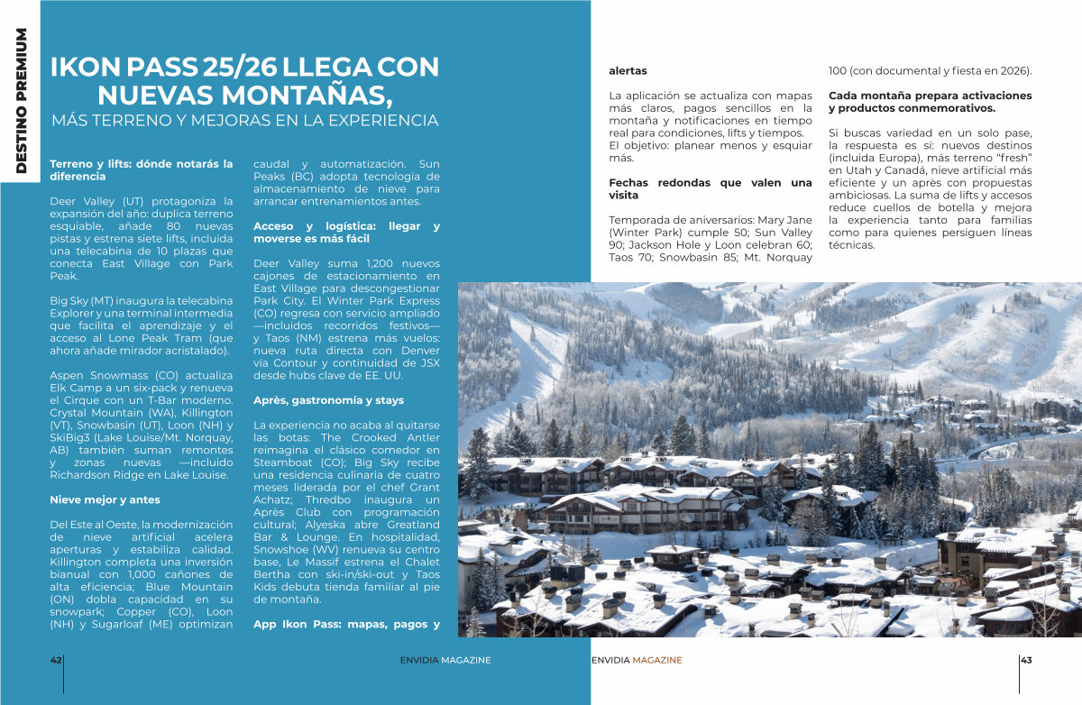 Deer Valley( UT) protagoniza la expansión del año: duplica terreno esquiable, añade 80 nuevas pistas y estrena siete lifts, incluida una telecabina de 10 plazas que conecta East Village con Park Peak.