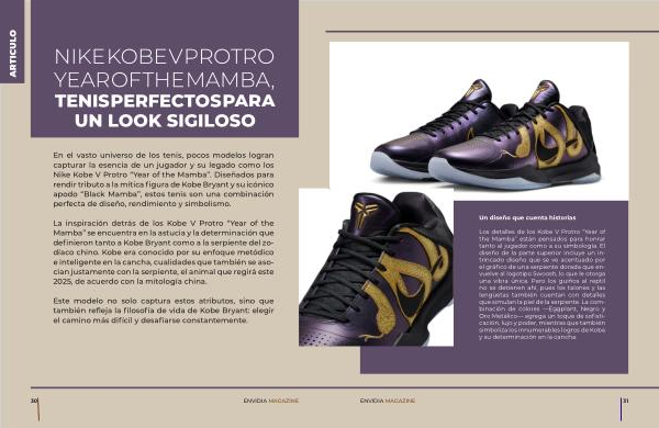 Los detalles de los Kobe V Protro “ Year of the Mamba ” están pensados para honrar tanto al jugador como a su simbología . El diseño de la parte superior incluye un intrincado diseño que se ve acentuado por el gráfico de una serpiente dorada que envuelve al logotipo Swoosh , lo que le otorga una vibra única . Pero los guiños al reptil no se detienen ahí , pues los talones y las lengüetas también cuentan con detalles que simulan la piel de la serpiente . La combinación de colores — Eggplant , Negro y Oro Metálico — agrega un toque de sofisticación , lujo y poder , mientras que también simboliza los innumerables logros de Kobe y su determinación en la cancha .