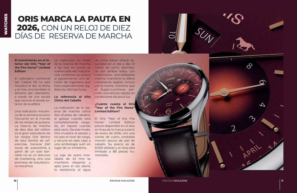 El Oris“ Year of the Fire Horse” Limited Edition estará disponible en el sitio en línea de la marca a partir de enero de 2026, con una correa de cuero cordobés marrón oscuro de piel de caballo. Su precio es de 8,000 dólares y el reloj está limitado a 88 piezas numeradas.