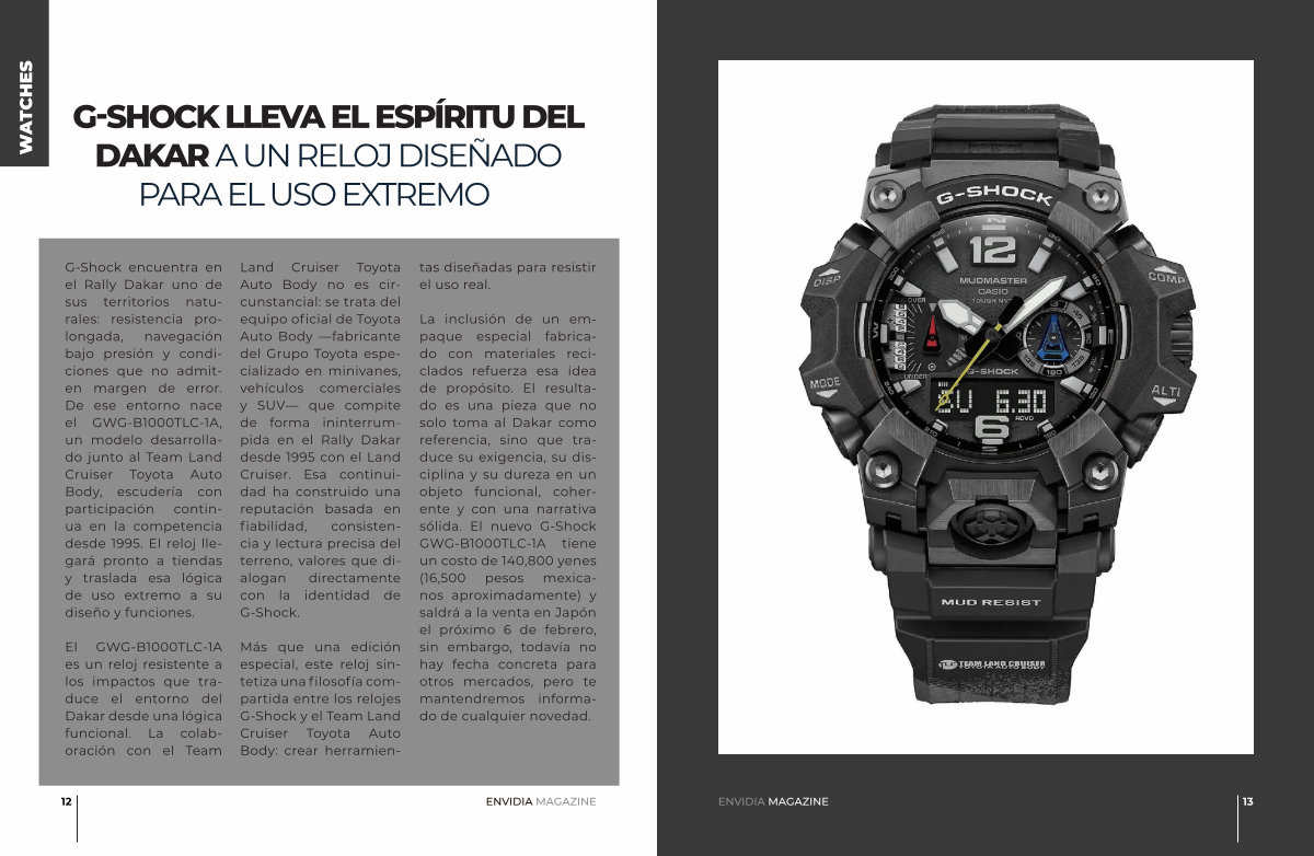 La inclusión de un empaque especial fabricado con materiales reciclados refuerza esa idea de propósito. El resultado es una pieza que no solo toma al Dakar como referencia, sino que traduce su exigencia, su disciplina y su dureza en un objeto funcional, coherente y con una narrativa sólida. El nuevo G-Shock GWG-B1000TLC-1A tiene un costo de 140,800 yenes( 16,500 pesos mexicanos aproximadamente) y saldrá a la venta en Japón el próximo 6 de febrero, sin embargo, todavía no hay fecha concreta para otros mercados, pero te mantendremos informado de cualquier novedad.