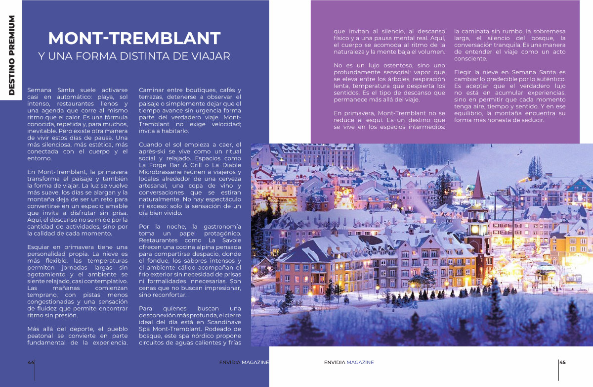 En primavera, Mont-Tremblant no se reduce al esquí. Es un destino que se vive en los espacios intermedios: la caminata sin rumbo, la sobremesa larga, el silencio del bosque, la conversación tranquila. Es una manera de entender el viaje como un acto consciente.
