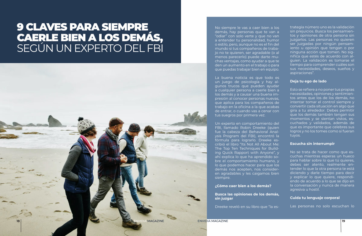 Un experto en comportamiento del FBI, llamado Robin Dreeke( quien fue la cabeza del Behavioral Analysis Program del FBI), encontró la fórmula para lograrlo. Dreeke escribió el libro“ Its Not All About Me: The Top Ten Techniques for Building Quick Rapport with Anyone”, y ahí explica lo que ha aprendido sobre el comportamiento humano, y lo que podemos hacer para que los demás nos acepten, nos consideren agradables y les caigamos bien siempre.