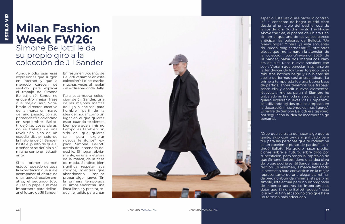 espacio. Esta vez quise hacer lo contrario”. El concepto de hogar quedó claro desde el principio del desfile, cuando la voz de Kim Gordon recitó The House Above the Sea, el poema de Chiara Barzini en el que uno de los versos parece anticipar las palabras de Bellotti:“ Un nuevo hogar. Y mira, ya está amueblado. Puedo imaginarnos aquí”. Entre otras piezas que me llamaron la atención de la colección otoño / invierno 2026 de Jil Sander, había dos magníficos blazers de piel, unos nuevos sneakers con suela Vibram que parecían inspirarse en la tendencia de los tenis torpedo, unos robustos botines beige y un blazer sin cuello de formas casi aristocráticas.“ La primera temporada fue una buena base de partida, ahora tenemos que trabajar sobre ella y añadir nuevos elementos. Nuevos, al menos para mí. Siempre he trabajado en la moda masculina y ahora quiero explorar nuevas vías. Empezamos utilizando tejidos que se emplean en la decoración, haciéndolos más ligeros”. El padre de Simone Bellotti era tapicero, por seguir con la idea de incorporar algo personal.