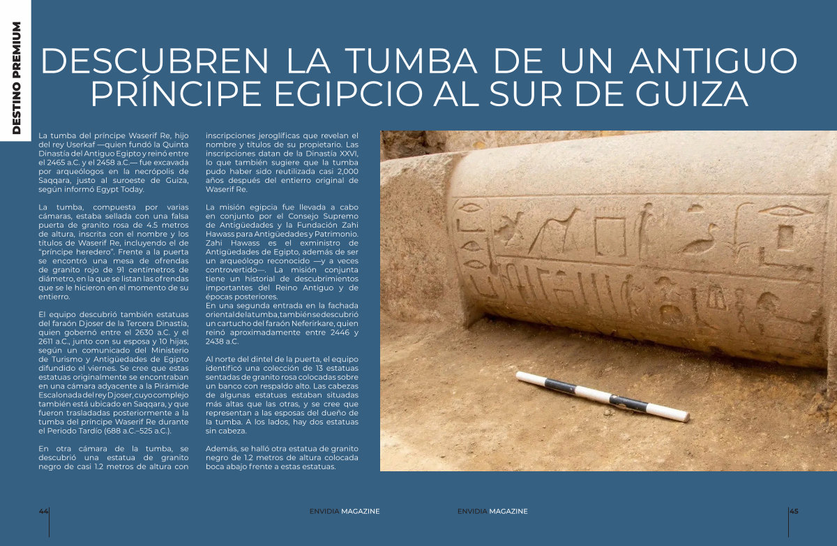 La tumba del príncipe Waserif Re, hijo del rey Userkaf— quien fundó la Quinta Dinastía del Antiguo Egipto y reinó entre el 2465 a. C. y el 2458 a. C.— fue excavada por arqueólogos en la necrópolis de Saqqara, justo al suroeste de Guiza, según informó Egypt Today. inscripciones jeroglíficas que revelan el nombre y títulos de su propietario. Las inscripciones datan de la Dinastía XXVI, lo que también sugiere que la tumba pudo haber sido reutilizada casi 2,000 años después del entierro original de Waserif Re.