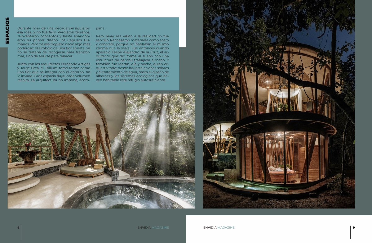 Junto con los arquitectos Fernando Artigas y Jorge Brea, el Trillium tomó forma como una flor que se integra con el entorno, no lo invade. Cada espacio fluye, cada volumen respira. La arquitectura no impone, acom- paña.