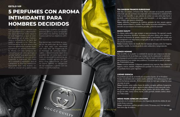 GUCCI GUILTY Un clásico imborrable y que siempre es muy pertinente . En especial , cuando necesitas demostrar fortaleza . Su aroma es un poco clásico , pero aunque recuerde a las fórmulas de antaño , estamos frente a una botella que resulta más que atemporal y con muy buena energía para lo que sea que estés haciendo en este preciso momento . Notas : lavanda , limón de Amalfi , flor del naranjo africano , cedro de Virginia , pachulíiy vainilla . La mezcla perfecta entre seducción y temperamento .