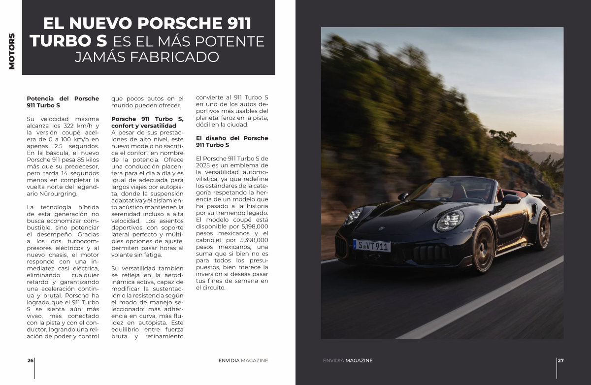 La tecnología híbrida de esta generación no busca economizar combustible, sino potenciar el desempeño. Gracias a los dos turbocompresores eléctricos y al nuevo chasis, el motor responde con una inmediatez casi eléctrica, eliminando cualquier retardo y garantizando una aceleración continua y brutal. Porsche ha logrado que el 911 Turbo S se sienta aún más vivao, más conectado con la pista y con el conductor, logrando una relación de poder y control que pocos autos en el mundo pueden ofrecer.