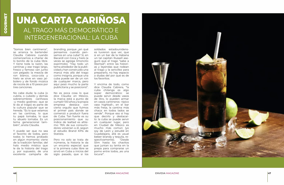 Y encima de todo, como dice Claudia Cabrera,“ la cuba chilanga es algo súper democrático: se puede servir desde vasos de litro, lo pueden armar en vasos cantineros – típico vaso highball –, en el bar más fresa, la cantina más chaca: en todos lados se vende”. Porque eso sí hay que decirlo y destacarlo: la cuba se puede servir en cualquier lugar, pero en Ciudad de México es mucho más común( yo soy de León y estudié en Guadalajara, allá es usual beber brandy y tequila, respectivamente).“ Desde Slim hasta los chavitos que juntan su lanita en la prepa para comprarse un pomo entre todos, ¡ es una locura!”.