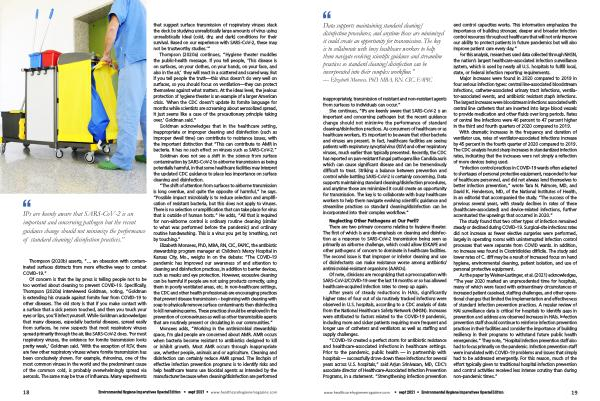 She continues , “ IPs are keenly aware that SARS-CoV-2 is an important and concerning pathogen but the recent guidance change should not minimize the performance of standard cleaning / disinfection practices . As consumers of healthcare or as healthcare workers , it ’ s important to be aware that other bacteria and viruses are present . In fact , healthcare facilities are seeing patients with respiratory syncytial virus ( RSV ) and other respiratory viruses , much earlier than typically presented . Recently , the CDC has reported on pan-resistant fungal pathogens like Candida auris which can cause significant disease and can be tremendously difficult to treat . Striking a balance between prevention and control while battling SARS-CoV-2 is certainly concerning . Data supports maintaining standard cleaning / disinfection procedures , and anytime those are minimized it could create an opportunity for transmission . The key is to collaborate with busy healthcare workers to help them navigate evolving scientific guidance and streamline practices so standard cleaning / disinfection can be incorporated into their complex workflow .”
