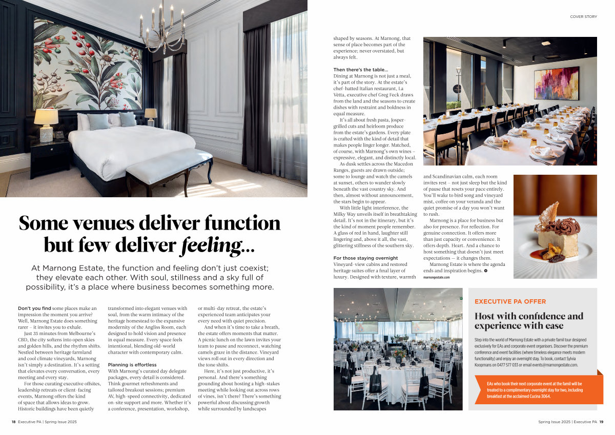 Step into the world of Marnong Estate with a private famil tour designed exclusively for EAs and corporate event organisers. Discover the premium conference and event facilities( where timeless elegance meets modern functionality) and enjoy an overnight stay. To book, contact Sylvia Koopmans on 0477 577 033 or email events @ marnongestate. com.