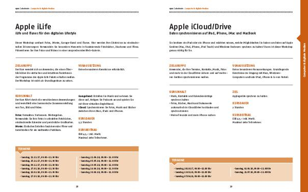 Dieser Workshop umfasst Fotos, iMovie, Garage-Band und iTunes. Hier werden Ihre Erlebnisse zu eindrucksvollen Erinnerungen: Verwandeln Sie besondere Momente in faszinierende Fotobücher, Diashows und Filme. Präsentieren Sie Ihre Fotos und Videos in einer ansprechenden Web-Galerie.