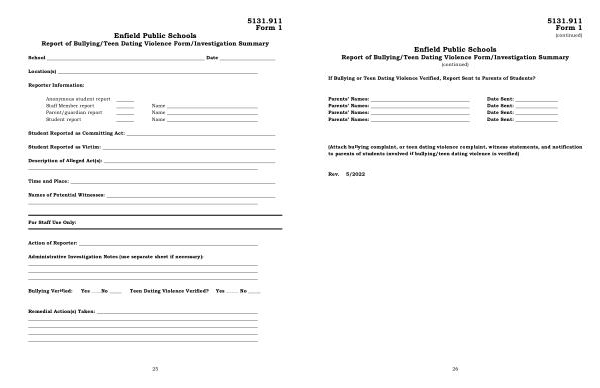 Enfield Public Schools Report of Bullying / Teen Dating Violence Form / Investigation Summary