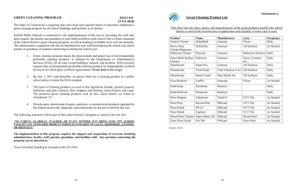 Enfield Public Schools is committed to the implementation of this law by providing the staff and , upon request , the parents and guardians of each child enrolled in each school with a written statement of the school district ’ s green cleaning program , as well as making it available on its web site annually . The administrative regulation will also be distributed to new staff hired during the school year and to parents or guardians of students transferring in during the school year .