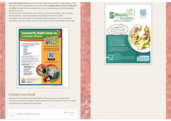 En eld Food Shelf partners with many En eld community services to provide various resources and supports to families . Please read the attached information to learn more about the opportunities available to the community .
