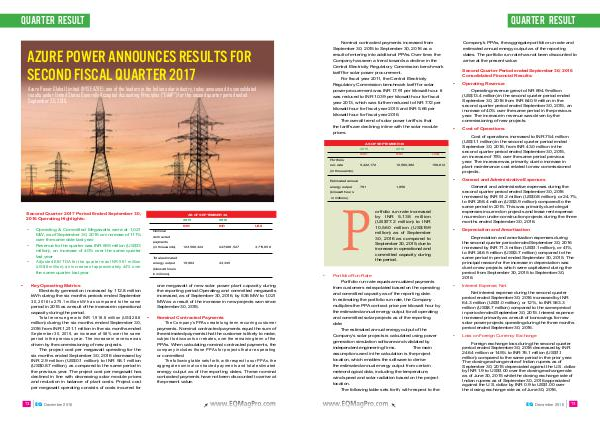 Azure Power Global Limited( NYSE: AZRE), one of the leaders in the Indian solar industry, today announced its consolidated results under United States Generally Accepted Accounting Principles(“ GAAP”) for the second quarter period ended September 30, 2016.