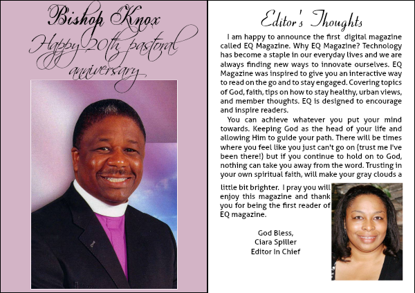 I am happy to announce the first digital magazine called EQ Magazine. Why EQ Magazine? Technology has become a staple in our everyday lives and we are always finding new ways to innovate ourselves. EQ Magazine was inspired to give you an interactive way to read on the go and to stay engaged. Covering topics of God, faith, tips on how to stay healthy, urban views, and member thoughts. EQ is designed to encourage and inspire readers.