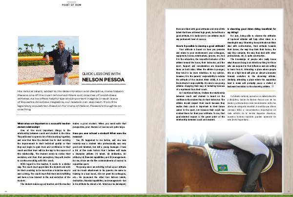 Su talento natural, sumado a su determinación y disciplina, hacen de Nelson Pessoa uno de los jinetes y entrenadores más renombrados entre los atletas de categoría mundial. A medida que ofrece consejos útiles y conocimientos importantes en cada edición de la revista Equestre Americas, nuestros lectores también pueden aprender de este jinete legendario.