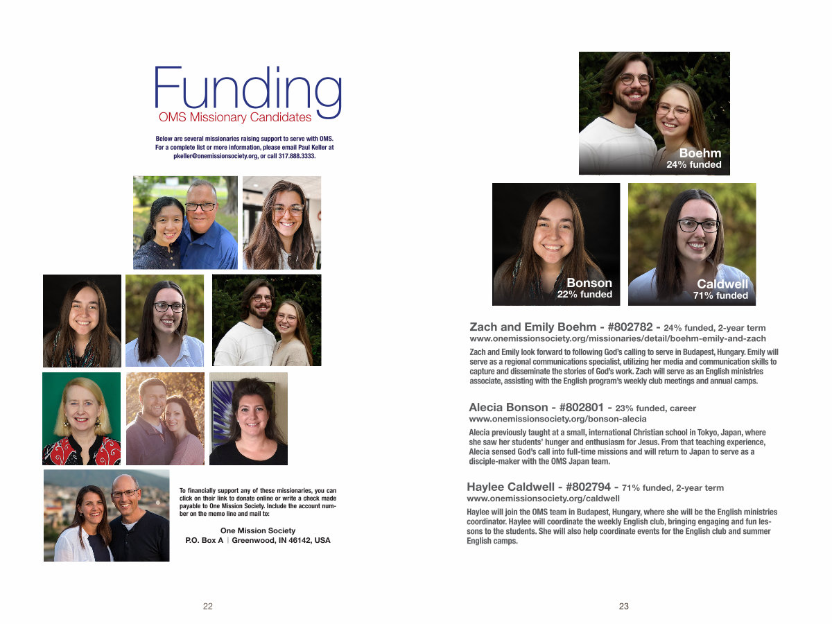 To financially support any of these missionaries, you can click on their link to donate online or write a check made payable to One Mission Society. Include the account number on the memo line and mail to: