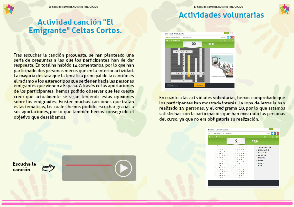 Tras escuchar la canción propuesta, se han planteado una sería de preguntas a las que los participantes han de dar respuesta. En total ha habido 14 comentarios, por lo que han participado dos personas menos que en la anterior actividad. La mayoría destaca que la temática principal de la canción es el racismo y los estereotipos que se tienen hacia las personas emigrantes que vienen a España. A través de las aportaciones de los participantes, hemos podido observar que les cuesta creer que actualmente se sigan teniendo estas opiniones sobre los emigrantes. Existen muchas canciones que tratan estas temáticas, las cuales hemos podido escuchar gracias a sus aportaciones, por lo que también hemos conseguido el objetivo que deseábamos.