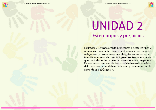 La unidad 2 se trabajaron los conceptos de estereotipos y prejuicios, mediante cuatro actividades de carácter obligatorio y voluntario. Las obligatorias consisten en identificar el sexo de unas imágenes teniendo en cuenta que no todo es lo parece, y contestar unas preguntas. Deben buscar una noticia de actualidad sobre la temática del racismo que deben publicar y comentar en la comunidad del Google +.