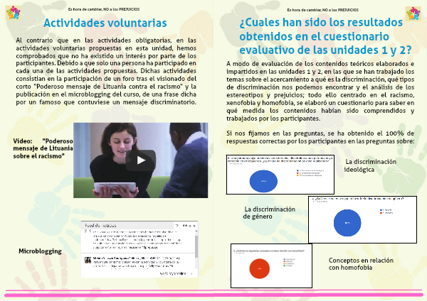 A modo de evaluación de los contenidos teóricos elaborados e impartidos en las unidades 1 y 2, en las que se han trabajado los temas sobre el acercamiento a qué es la discriminación, qué tipos de discriminación nos podemos encontrar y el análisis de los estereotipos y prejuicios; todo ello centrado en el racismo, xenofobia y homofobia, se elaboró un cuestionario para saber en qué medida los contenidos habían sido comprendidos y trabajados por los participantes.