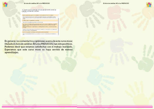 En general, los comentarios y opiniones acerca de este curso mooc titulado Es hora de cambiar, NO a los PREJUICIOS, han sido positivos. Podemos decir que estamos satisfechas con el trabajo realizado. Esperamos que este curso mooc os haya servido de nuevos aprendizajes.