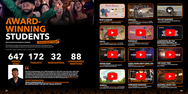 My time at Escape gave me a solid foundation in VFX that I use every day, while also strengthening my collaborative and professional skills. It prepared me to network confidently and create opportunities within the creative industries. My proudest moment since graduating has been being nominated three times for Best VFX and becoming a finalist for my work on Genesis: No Old Thinking at the British Arrows.