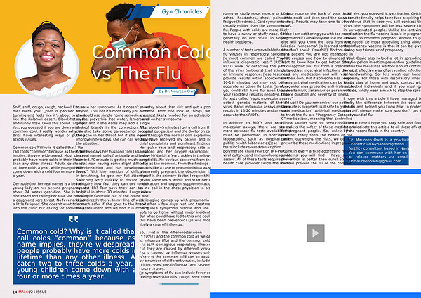 Gertrude ( not her real name ) is a beautiful young lady on her second pregnancy at about 24 weeks gestation . She is a bit distressed and calling because she is having a cough and sore throat . No fever and just a little fatigued . She doesn ’ t want to come into the clinic but asking for something to ease her symptoms . As it doesn ’ t sound serious , I tell her it ’ s most likely just a cold she could use simple home remedies , such as the proverbial hot water , lemon and ginger and if she dares may add a single shot of brandy in the concoction . She can also take some paracetamol to ease the ache in her throat but if she doesn ’ t improve in few days , she can call we assess the situation .