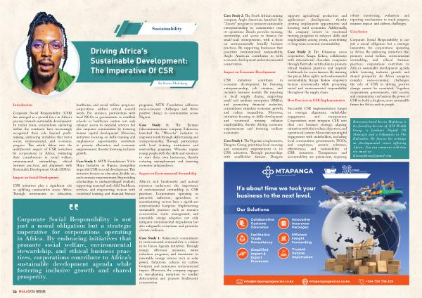 Corporate Social Responsibility is not just a moral obligation but a strategic imperative for corporations operating in Africa . By embracing initiatives that promote social welfare , environmental stewardship , and ethical business practices , corporations contribute to Africa ' s sustainable development agenda while fostering inclusive growth and shared prosperity .