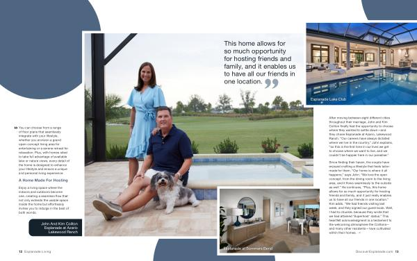 After moving between eight different cities throughout their marriage , John and Kim Coliton finally had the opportunity to choose where they wanted to settle down — and they chose Esplanade at Azario , Lakewood Ranch . “ Our careers have always dictated where we live in the country ,” John explains , “ so this is the first time in our lives we get to choose where we want to live , and we couldn ’ t be happier here in our paradise .”