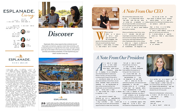 2024 , Esplanade Resort Experiences . All rights reserved . This publication may not be reproduced , all or in part , without written consent from the publishers . Every effort has been made to ensure the accuracy of all content in this publication , however , the publishers will not be held responsible for omissions or errors . Articles , reports and information contained herein reflect the views of the individuals who wrote or prepared them and do not necessarily represent the position of the publishers . The material herein is intended for educational and informational purposes only . Nothing herein is to be considered the rendering of advice for specific cases or circumstances . Communication of any information contained herein does not constitute an attorney-client relationship , nor convey advice or recommendation of any kind . Do not rely on information contained herein to replace consultation with qualified industry leaders or other professionals in your jurisdiction . Please address all editorial and advertising inquiries to , email : EREMarketing @ taylormorrison . com . Taylor Morrison is not held responsible for the loss , damage or any other injury to unsolicited material ( including but not limited to manuscripts , artwork , photographs and advertisements ). Unsolicited material must include a self-addressed , overnight-delivery return envelope , postage prepaid . Tulip Media Group and Taylor Morrison will not give or rent your name , mailing address , or other contact information to third parties . Magazines are complimentary for qualified individuals . Esplanade includes both 55 + and all-ages communities . All information ( including , but not limited to prices , views , availability , features , standards and options , assessments , and fees , planned or included amenities , programs , conceptual artists ' renderings , community development plans ) is not guaranteed and remains subject to change , or delay without notice . Activities , amenities , venues , and local events listed within are for informational purposes only , vary by location , are without guarantee and subject to change outside of Taylor Morrison ' s control . Please contact each location directly for further current complete details . Some photos are for illustration only and do not necessarily represent actual community . Community improvements , recreational features and amenities described may be based upon current development plans which are subject to change and under no obligation to be completed . Contents intended to represent Taylor Morrison ’ s Esplanade ® lifestyle brand ; amenities and features will vary by community . Community Association and other fees may apply for certain activities and events . This is not an offering in any state where prohibited or otherwise restricted by law . Please see a Taylor Morrison Community Sales Manager for details and visit www . taylormorrison . com for additional disclaimers . © November 2024