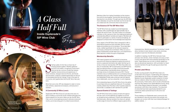 The SIP Wine Club was created to provide Esplanade members with a sophisticated yet approachable way to explore the world of wine . The club ’ s mission is to educate members on the nuances of wine , from tasting and pairing to understanding different varietals and regions . Members are invited to participate in a variety of events and tastings , all designed to enhance their wine knowledge and enjoyment .