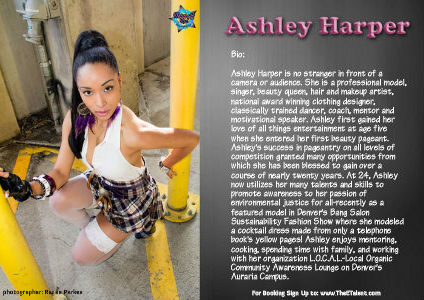 Ashley Harper is no stranger in front of a camera or audience. She is a professional model, singer, beauty queen, hair and makeup artist, national award winning clothing designer, classically trained dancer, coach, mentor and motivational speaker. Ashley first gained her love of all things entertainment at age five when she entered her first beauty pageant. Ashley's success in pageantry on all levels of competition granted many opportunities from which she has been blessed to gain over a course of nearly twenty years. At 24, Ashley now utilizes her many talents and skills to promote awareness to her passion of environmental justice for all-recently as a featured model in Denver's Bang Salon Sustainability Fashion Show where she modeled a cocktail dress made from only a telephone book's yellow pages! Ashley enjoys mentoring, cooking, spending time with family, and working with her organization L.O.C.A.L.-Local Organic Community Awareness Lounge on Denver's Auraria Campus.