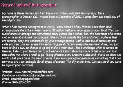 My name is Renee Parkes and I am the owner of Naturally Red Photography. I’m a photographer in Denver, CO. I moved here in December of 2011. I came from the small city of Grand Junction.