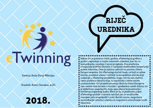 Nakon što je pokrenut 2005. godine, eTwinning iz godine u godinu napreduje u svojim osnovnim ciljevima, kao što su komunikacija, suradnja i razvoj projekata. Ova platforma omogućuje podršku školama u razvijanju međusobne kooperacije putem interneta, čime je njezina važnost na prostoru čitave Europe neupitna. Od eTwinninga koristi imaju svi koji se njime koriste, posebice učenici i učitelji. Iz perspektive učenika koji sudjeluje u eTwinning projektima, mogu reći da sam doživio samo pozitivna iskustva koja su rezultirala i nekim novim poznanstvima. Ovi projekti povezuju škole iz čitave Europe te sam samim time dolazio u kontakt s građanima raznih država, što je definitvno unaprijedilo moju sposobnost komunikacije i korištenja engleskog jezika. Bitno je da se platforme poput eTwinninga podrže i nastave razvijati, jer će se njihovim razvojem jače unaprijediti i svaki školski sustav, mogućnost komunikacije učitelja i učenika te mogućnost ostvarivanja novih iskustava.