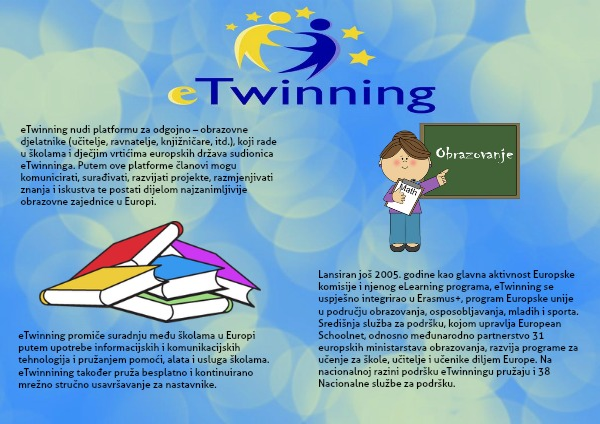 eTwinning promiče suradnju među školama u Europi putem upotrebe informacijskih i komunikacijskih tehnologija i pružanjem pomoći, alata i usluga školama. eTwinnining također pruža besplatno i kontinuirano mrežno stručno usavršavanje za nastavnike.