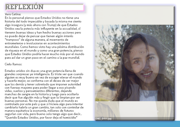 En lo personal pienso que Estados Unidos no tiene una historia del todo impecable y basada la misma me siento algo insegura (y más ahora con Trump) de que Estados Unidos sea la potecia más influyente en la accualidad, sí tienenn buenas ideas y han hecho buenas acciones pero no puedo dejar de pensar que tienen algún interés "tramposo" de alguna manera, al moemento de entrometerse o involucrarse en acontecimientos mundiales. Como hemos visto hay una pésima distribución de riqueza en el mundo y como una gran potencia, pienso que Estados Unidos podría hacer mucho más por el mundo para así dar un gran paso en el camino a la paz mundial.