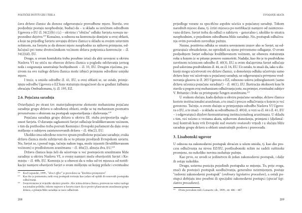 U svakom slučaju , kada djeluju u okviru pojačane saradnje , države članice koriste institucionalni aranžman , a to znači i proces odlučivanja o kojem je već govoreno . Tačnije , u ovom slučaju se primjenjuju odredbe Naslova VI Ugovora o EU , a to znači – u skladu sa odredbama čl . 40 ( 4 ), u vezi sa čl . 44 i čl . 41 , EU – i odgovarajući dijelovi komunitarnog institucionalnog aranžmana . U skladu s tim , već rečeno o vrstama akata , njihovom donošenju , primjeni i ( djelimičnoj ) kontroli koju vrši Evropski sud mutatis mutandis vrijedi i u slučaju bliže saradnje grupe država u oblasti unutrašnjih poslova i pravosuđa .