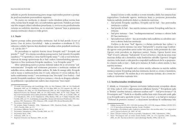 Uz ostale , ovim povodom vidi Lasok / Bridge , 1994 ., str . 244 ; Chalmers , 1998 ., str . 116 ; Weatherill / Beaumont , 1999 ., str . 173 ; Mathijsen , 1999 ., str . 124 ; Shaw , 2000 ., str . 152 ; Lenaerts i dr ., 2005 ., str . 441 ; Chalmers i dr ., 2006 ., str . 120 ; Wyatt / Dashwood , 2006 ., str . 391 ; Craig / de Búrca , 2008 ., str . 66 ; Kapteyn / VerLoren van Themaat , 2008 ., str . 231 ; McCormick , 2008 ., str . 85 . Vidi i Degan , 1965 ., kao svojevrsni pionirski rad na našim prostorima ; Mlikotin-Tomić , 1989 ., str . 11 ; Rodin , 1990 ., str . 173 ; Vukadinović , 1991 ., str . 83 ; Vukadinović , 1996a ; Hartley , 1998 ., str . 57 ; Rakić-Vodinelić , 1998 .; Čavoški , 2006 ., str . 171 . Za detaljniju , monografsku , obradu vidi Schermers / Waelbroeck , 1992 .; Bengoetxea , 1993 .; Rasmussen , 1998 .; Dehousse , 1998 .; Arnull , 1999 .; Brown / Kennedy , 2000 .
