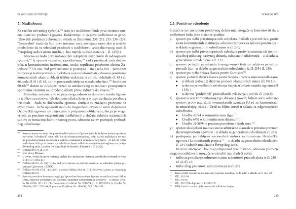 Služeći se tzv . metodom pozitivnog definisanja , moguće je konstatovati da u nadležnost Suda prve instance spadaju : a ) sporovi po tužbi privatnopravnih subjekata , fizičkih i pravnih lica , protiv akata komunitarnih institucija , odnosno zahtjeva za njihovo poništenje – u skladu sa generalnim određenjem iz čl . 230 ; b ) sporovi po tužbi privatnopravnih subjekata protiv komunitarnih institucija zbog njihovog pasivnog držanja , odnosno nedjelovanja – u skladu sa generalnim određenjem iz čl . 232 ; c ) sporovi po tužbi za naknade ( vanugovorne ) štete po zahtjevu privatnopravnih lica – u skladu sa generalnim određenjem iz čl . 235 i čl . 238 ; d ) sporovi po tužbi država članica protiv Komisije ; 771 e ) sporovi po tužbi država članica protiv Savjeta u vezi sa mjerama / odlukama
