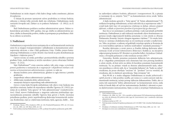 • smanjenju slučajeva nepravilnog rada administracije . Govor o tome kako Evropski ombudsman vidi ciljeve svoje funkciju ima specifično značenje , budući da mjerodavna odredba Ugovora ( čl . 159 ( 1 )) pominje ali ne definiše “ lošu upravu ” ili “ loše administriranje ” ( maladministration ). Otud , stavovi Ombudsmana o njegovim zadacima predstavljaju operacionalizaciju pomenute odredbe Ugovora koja govori o borbi , iniciranoj pritužbama građana , protiv neprihvatljivog djelovanja komunitarnih institucija . Konkretnije , riječ je o djelovanju institucija , tijela , agencija , službi ... koje