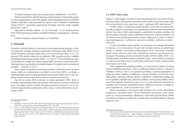 Evropska centralna banka je svojevrsna kruna integracionog projekta u oblasti monetarne saradnje , odnosno ekonomsko-monetarne unije ( EMU ). Na to mjesto Evropska centralna banka stiže sa tzv . trećom fazom EMU , tj . sa 1 . januarom 1999 . godine , nakon što je sredinom 1998 . preuzela poslove i zadatke Evropskog monetarnog instituta ( EMI ) – čl . 123 ( 2 ). 999 Ovaj posljednji je , opet , sa početkom tzv . druge faze uspostavljanja EMU zamijenio svojevremeni Komitet guvernera nacionalnih centralnih banaka i Evropski fond za monetarnu saradnju – u smislu čl . 117 ( 1 ).