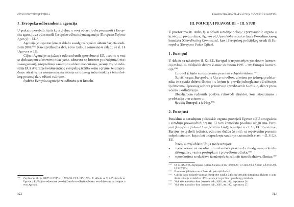 Paralelno sa saradnjom policijskih organa , postojeći Ugovor o EU omogućava i saradnju pravosudnih organa . U tom kontekstu posebnu ulogu ima Eurojust ( European Judicial Co-operation Unit ), temeljen u čl . 31 , EU . Preciznije , Eurojust je tijelo ili jedinica , odnosno služba ( a unit ), sa sopstvenim pravnim subjektivitetom , koja služi unapređenju saradnje nacionalnih vlasti – čl . 31 ( 2 ), EU . Inače , u ovoj oblasti Unija može usvajati :