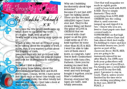 I bet that wall magazine we made in eighth grade could've been held with BLUE & RED. They're simply famtastic! They stick everything from LOVE AND CHERISH onto the ceiling (that is, until someone jumped up and ripped it in two - I know who you are, btw) to chart paper onto dust covered walls to SOPHOMORES on that high ceiling wall where Zayn and Sam almost died, (not really, I'm kidding) to runes and Jace Herondale (marry me, Jace!)quotes as part of the classroom decor. BLUE, RED, you are going to be immensely missed by me after March. I'm 100% sure both your godmothers will take good care of you (If not, I'm turning into a serial killer and you'll be my first kill, guys). I promise to stay in touch. That is, unless you're finished by the time we're done sticking everything else. In that case, REST IN PEACE. ;)