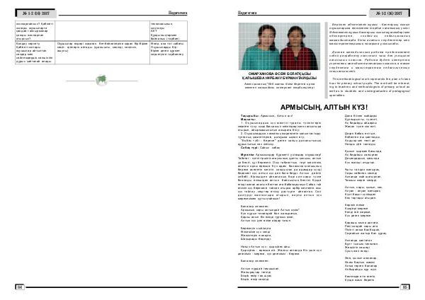 Тақырыбы: Армысың, Алтын күз! Мақсаты: 1. Оқушылардың күз мезгілі туралы түсініктерін кеңейте түсу; күзді басқа жыл мезгілдері мен салыстыра отырып, айырмашылығын ажырата білу; 2. Оқушылардың сахналық мәдениетін қалыптастыру; тұлғалық қасиеттерінің дамуына ықпал ету;