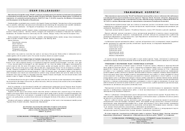 On all matters concerning the publication of papers in the journal " Еуразия білімі. Eurasian education. Евразийское образование " please contact the Educational Research Centre " ERUDIT " by phone:
