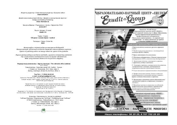 Басылды / Напечатано в / Journal is published " ImPress " баспасы / Издательство " ImPress " / Publishing house " ImPress " 071400 Семей қаласы, Найманбаев к-сі, 163, 2 офис г. Семей, ул. Найманбаева, 163, офис 2 Semey, Naimanbayev Street, 163, office 2 Тел / Tel: + 7( 7222) 56 04 56