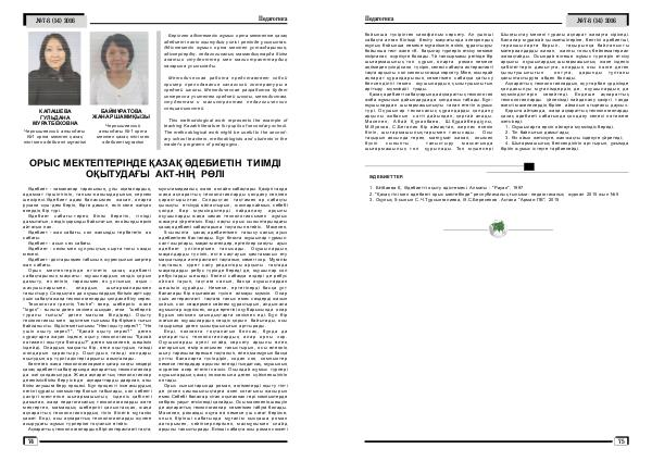 This methodological work represents the example of teaching Kazakh literature for pupils of secondary school. The methodological work might be useful to the secondary school teachers, methodologists and students in the master ' s programs of pedagogics.