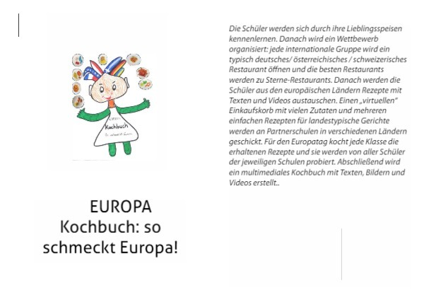 Die Schüler werden sich durch ihre Lieblingsspeisen kennenlernen. Danach wird ein Wettbewerb organisiert: jede internationale Gruppe wird ein typisch deutsches/ österreichisches / schweizerisches Restaurant öffnen und die besten Restaurants werden zu Sterne-Restaurants. Danach werden die Schüler aus den europäischen Ländern Rezepte mit Texten und Videos austauschen. Einen „virtuellen“ Einkaufskorb mit vielen Zutaten und mehreren einfachen Rezepten für landestypische Gerichte werden an Partnerschulen in verschiedenen Ländern geschickt. Für den Europatag kocht jede Klasse die erhaltenen Rezepte und sie werden von aller Schüler der jeweiligen Schulen probiert. Abschließend wird ein multimediales Kochbuch mit Texten, Bildern und Videos erstellt..